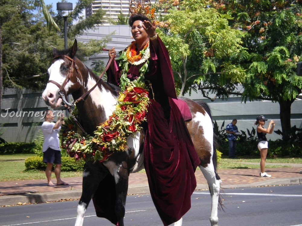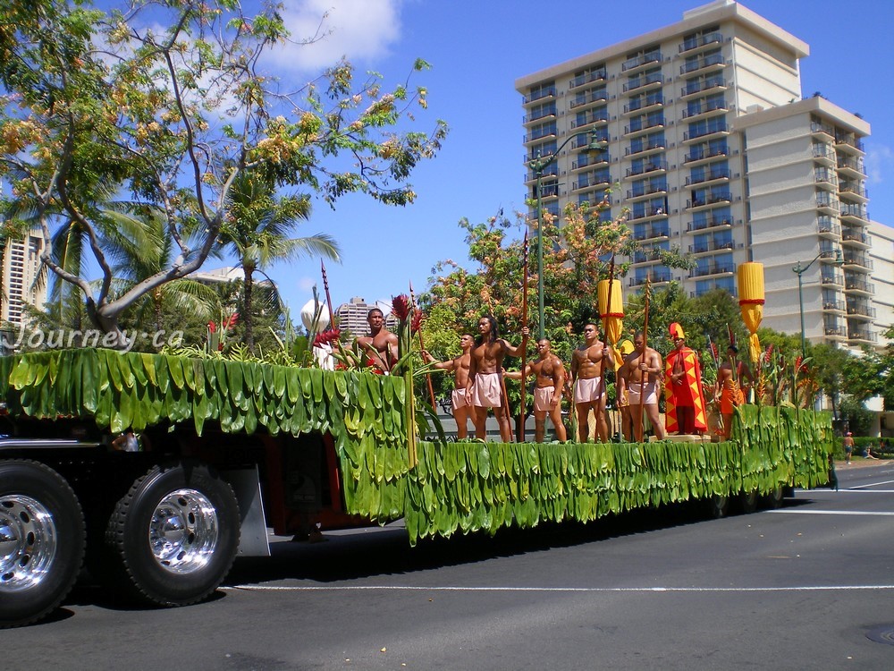One of the most popular parade floats is that which carries King Kamehameha and his tattooed warriors. Every year, someone from the Hawaiian community is selected to be the Mōʻī, the sovereign King Kamehameha I. Draped in royal yellow regalia, the Mōʻī stands proudly surrounded by his attending koa, warriors, all with spears in hand.