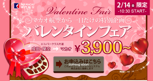 マカオ航空は、2014年2月14日午前10時30分より、東京/成田・大阪/関西〜マカオ線を片道3,900円から発売する「バレンタインフェア」を開催すると発表しました。