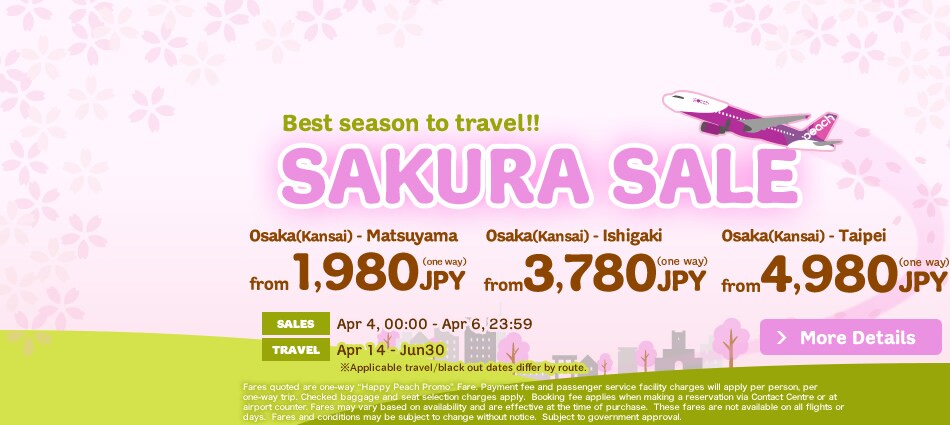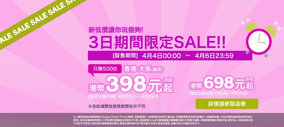3日期間限定SALE!優惠期由4月4日00:00時至4月6日23:59止! Peach希望和您在天空相會!