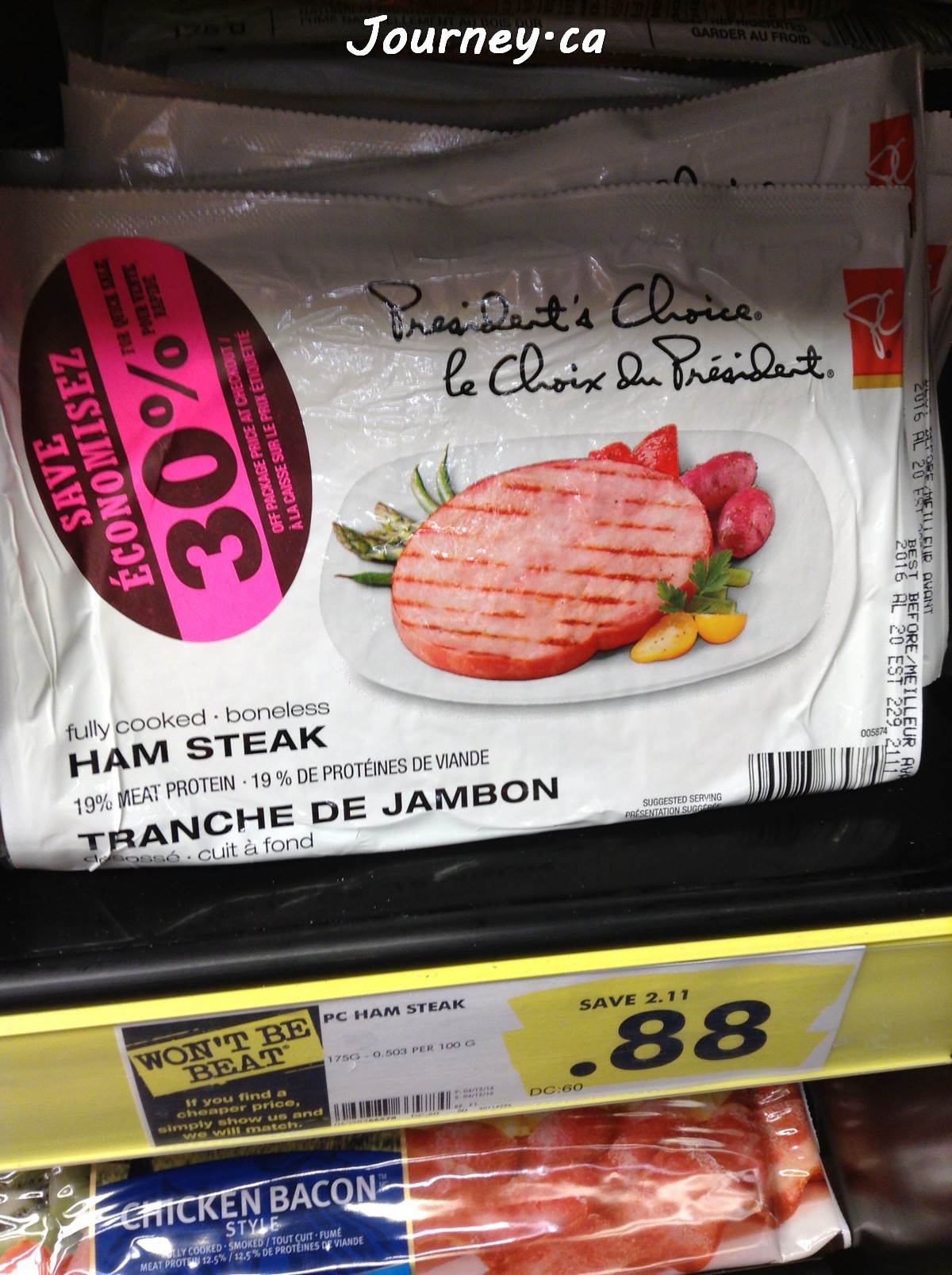 HAM Steak 175g $0.61。175克火腿排,原价2.99加元,特价0.88加元,还可有额外7折。促销原因是距离最佳食用期还剩10天了。