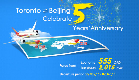 Over the five years since the launch of the Toronto-Beijing route, Hainan Airlines has received wide acclaim and been honored as a Skytrax five-star airline for the past five consecutive years. To look ahead to the next five years with even higher expectations, Hainan Airlines is pleased to announce the following discounts!