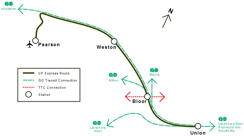 Union Pearson Express机场快线由1号航站楼通往多伦多市中心的联合车站(Union Station),途径两个换乘车站。每15分钟一趟车,全程25分钟。航站楼有机场快线火车的明显指示牌。