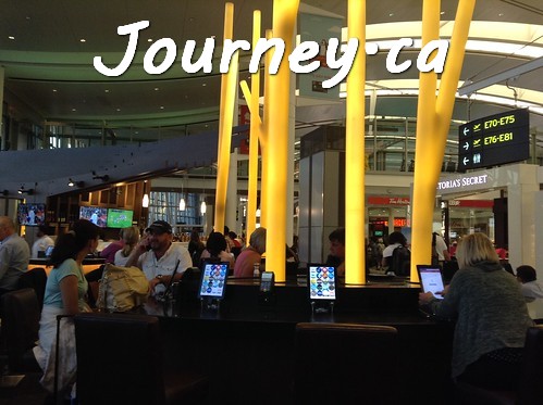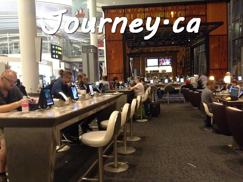 多伦多机场的候机区大部分已经改为综合了优质餐馆、酒吧服务的休闲区。所有乘客,即便不进行任何消费也欢迎使用这些舒适的座位。每个座位上都有充电插口和一部苹果iPad平板电脑供乘客免费使用。iPad提供中文等多种语言服务。建议先选择好自己的航班,这样到时候系统会自动提醒登机,而不至于让你错过航班。iPad除了可以阅读、玩游戏以外,也是点餐、点饮料的唯一途径。菜单也有中文版,但都是机器自动翻译的,牛头不对马嘴。餐饮价格比较高,但品质也很好。点餐后可直接在平板电脑旁的刷卡设备刷卡(不收现金),支付后服务员会将餐点送到你的桌上。客人离开后,服务员会来清理桌子,不劳您自己打扫。