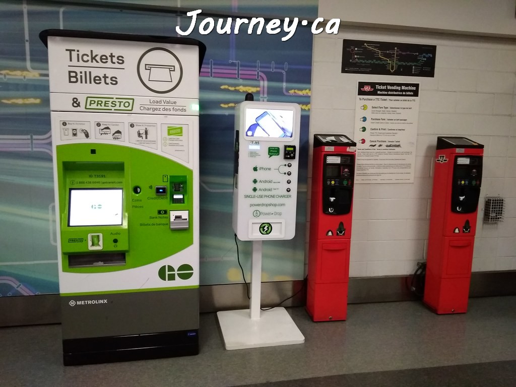 绿色的售票机可以购买GO车票以及给Presto公交卡充值。红色的售票机可以用信用卡或硬币购买TTC车票。
