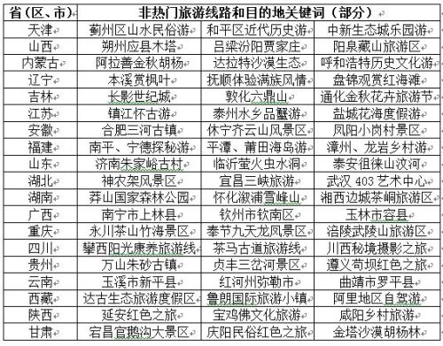 一些新兴的旅游线路和目的地未受到较多关注,部分热门的旅游线路和目的地进入相对淡季,在假日期间选择前往将大大提升旅游的品质,丰富旅行的内涵。为方便广大游客,部分省(市、区)旅游主管部门根据历年同期假日旅游情况,整理了一份非热门旅游线路和目的地关键词,以供参考。