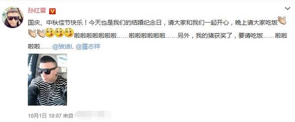 凤凰网娱乐讯 10月1日是祖国的生日,也是孙红雷和老婆王骏迪3周年的结婚纪念日,当天孙红雷在微博中更新动态写道:“国庆、中秋佳节快乐!今天也是我们的结婚纪念日,请大家和我们一起开心,晚上请大家吃饭,啦啦啦啦啦啦啦,啦啦啦啦啦啦,另外,我的猪获奖了,要请吃饭”。