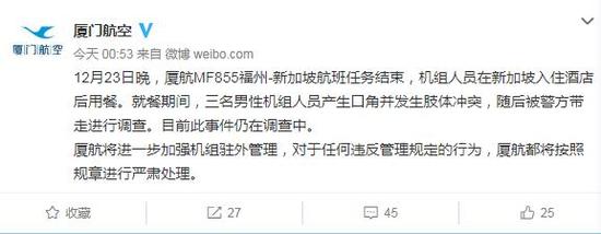 【环球网综合报道】厦门航空官方微博今日凌晨通报称,12月23日晩,厦航MF855福州-新加坡航班任务结束,机组人员在新加坡入住酒店后用餐。就餐期间,三名男性机组人员产生口角并发生肢体冲突,随后被警方带走进行调查。目前此事件仍在调查中。