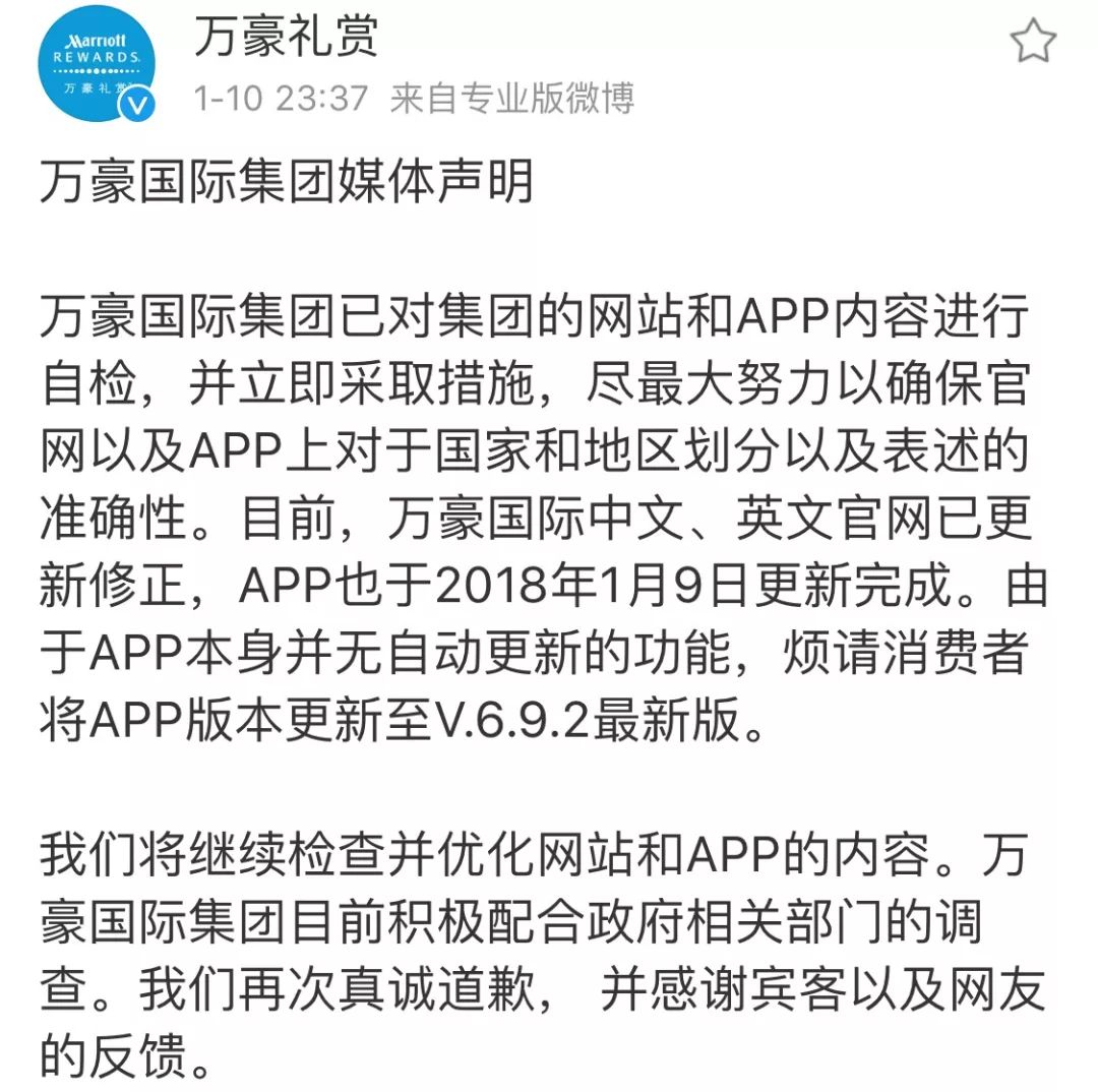 10日23时37分,万豪国际集团通过“万豪礼赏”微博账号发表媒体声明,表示“再次真诚道歉”。
