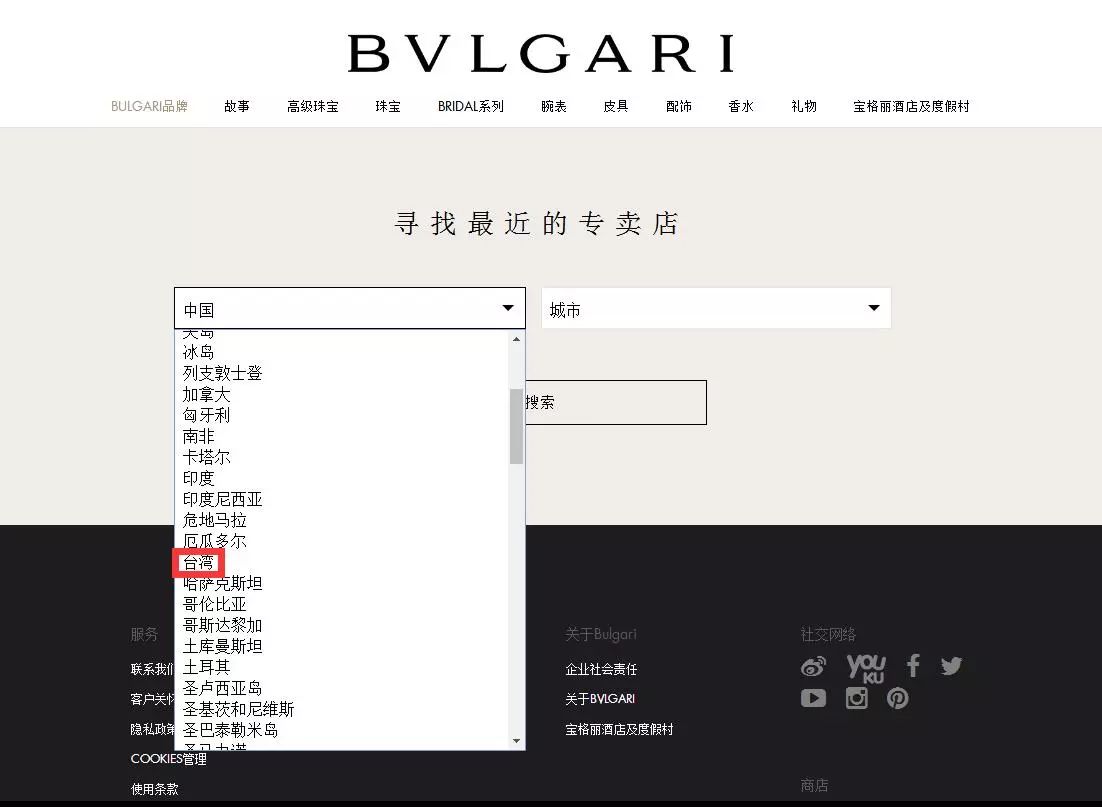 ▲BVLGARI宝格丽中国官方网站截图,其将台湾列在国家选项中