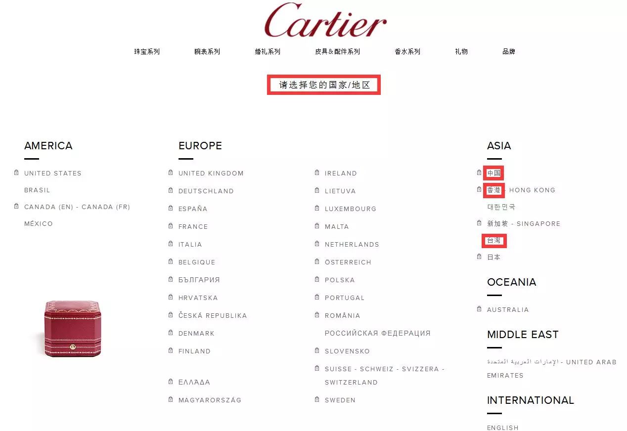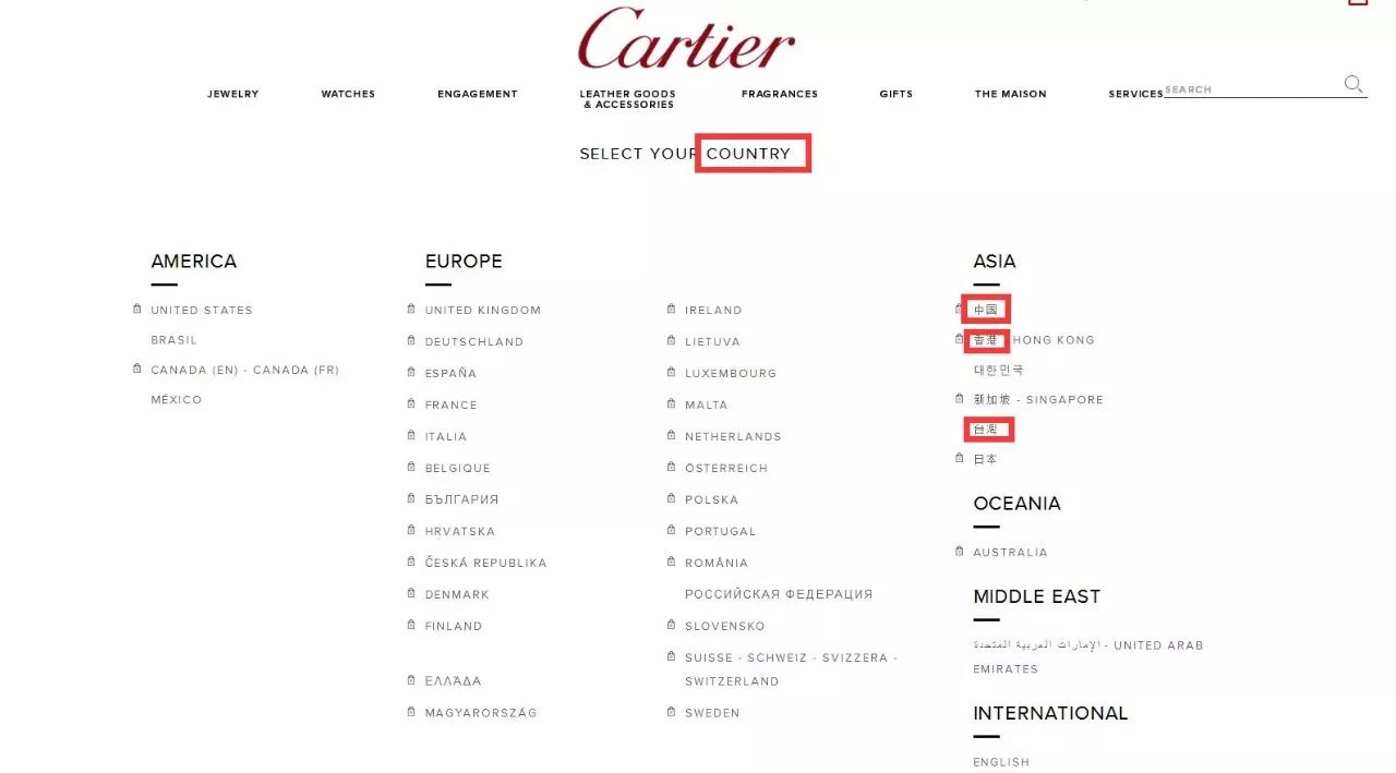▲卡地亚官网截图,卡地亚中文网站写明“国家/地区”,但英文版却只有“country”