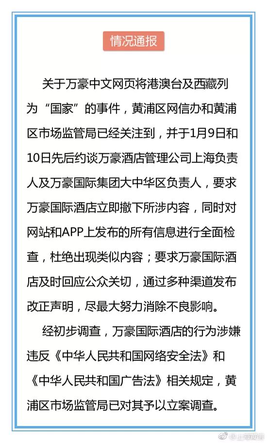 1月10晚间,上海黄浦区新闻办官方微博@上海黄浦 发布通报称,已约谈万豪酒店管理公司上海负责人及万豪国际集团大中华区负责人,并称万豪国际酒店的行为涉嫌违反《中华人民共和国网络安全法》和《中华人民共和国广告法》相关规定,黄浦区市场监管局已对其予以立案调查。