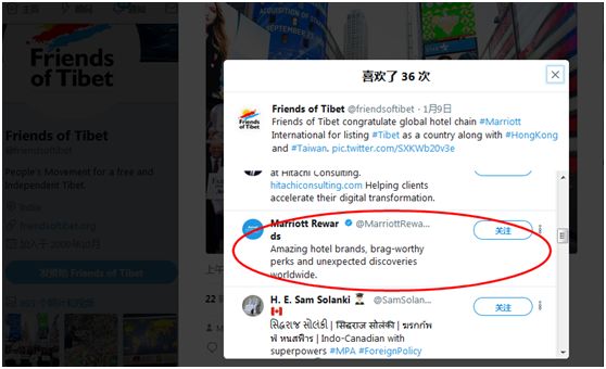 在此稿发出前不久,万豪礼赏推特账号取消了对“西藏之友”的点赞。