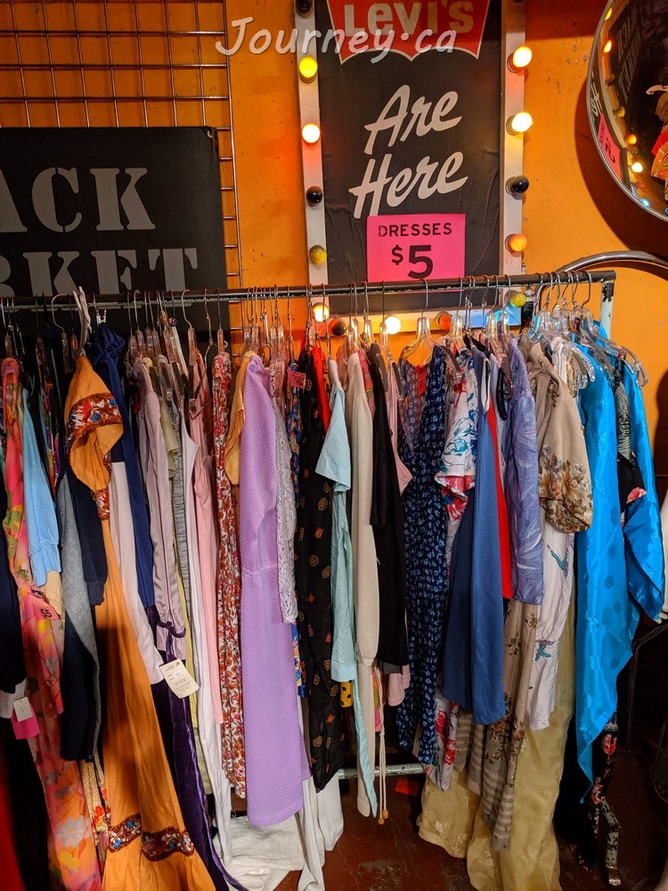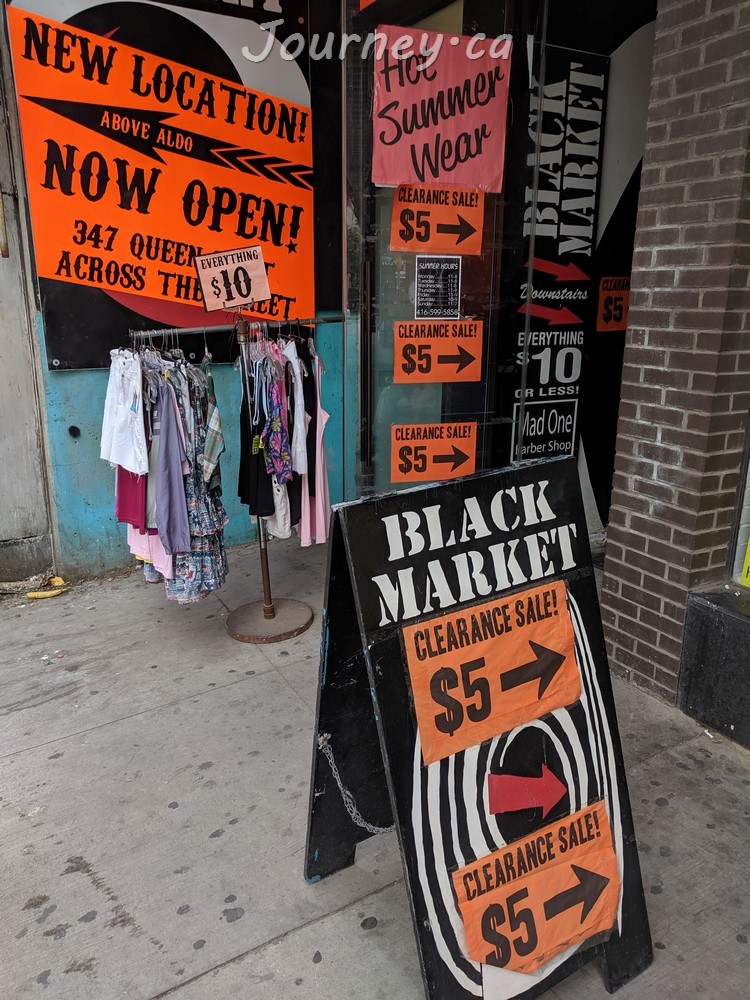多伦多的二手服装店有不少,但价格最便宜的无异是位于皇后西街的“黑市”,所有商品售价不超过10加元,即便是皮夹克或羊毛大衣也最多卖10加元,而且有的成色还很新。“黑市”同时也出售一些价格低廉的新品,例如复古/怪异图案的T-shirt、5加元的太阳镜。