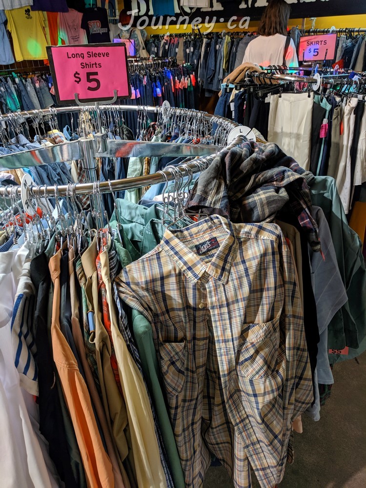 “黑市”成立于1980年,1998年搬入现在的地点。这里是一处空间很大的地下室,一开始的时候有很多剩余空间转租给其他小店,但目前只有一家卖黑胶老唱片的Good Music和一家人气很旺的理发店Mad One Barber Shop(理发20加元起),剩余空间都被“黑市”的低价服装挤得满满的。