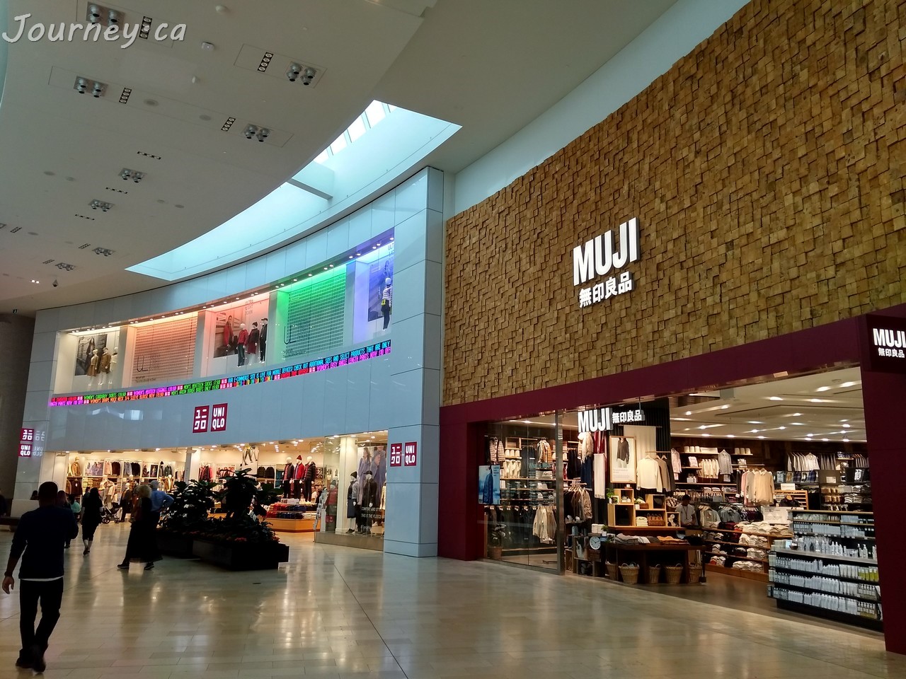 穿越一条封闭式走廊,即可进入购物中心。此时左转就是奢侈品大街,各种顶级奢侈品牌汇聚,右转则是星巴克和Roots。