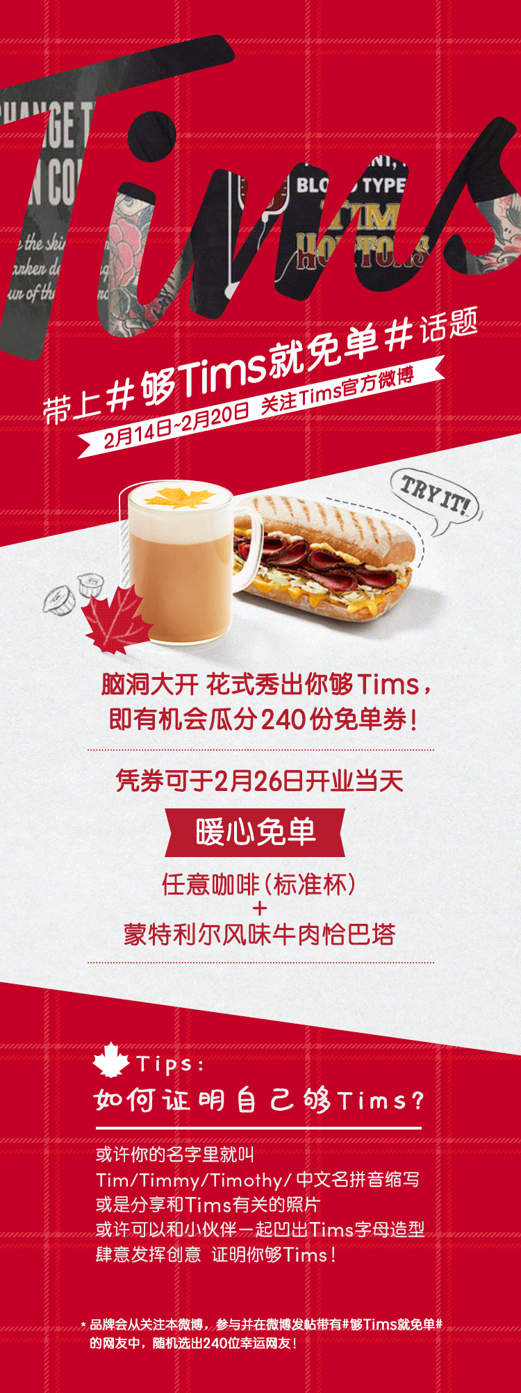 2月14日-20日Tim Hortons上海店将送出240份套餐,详情见图: