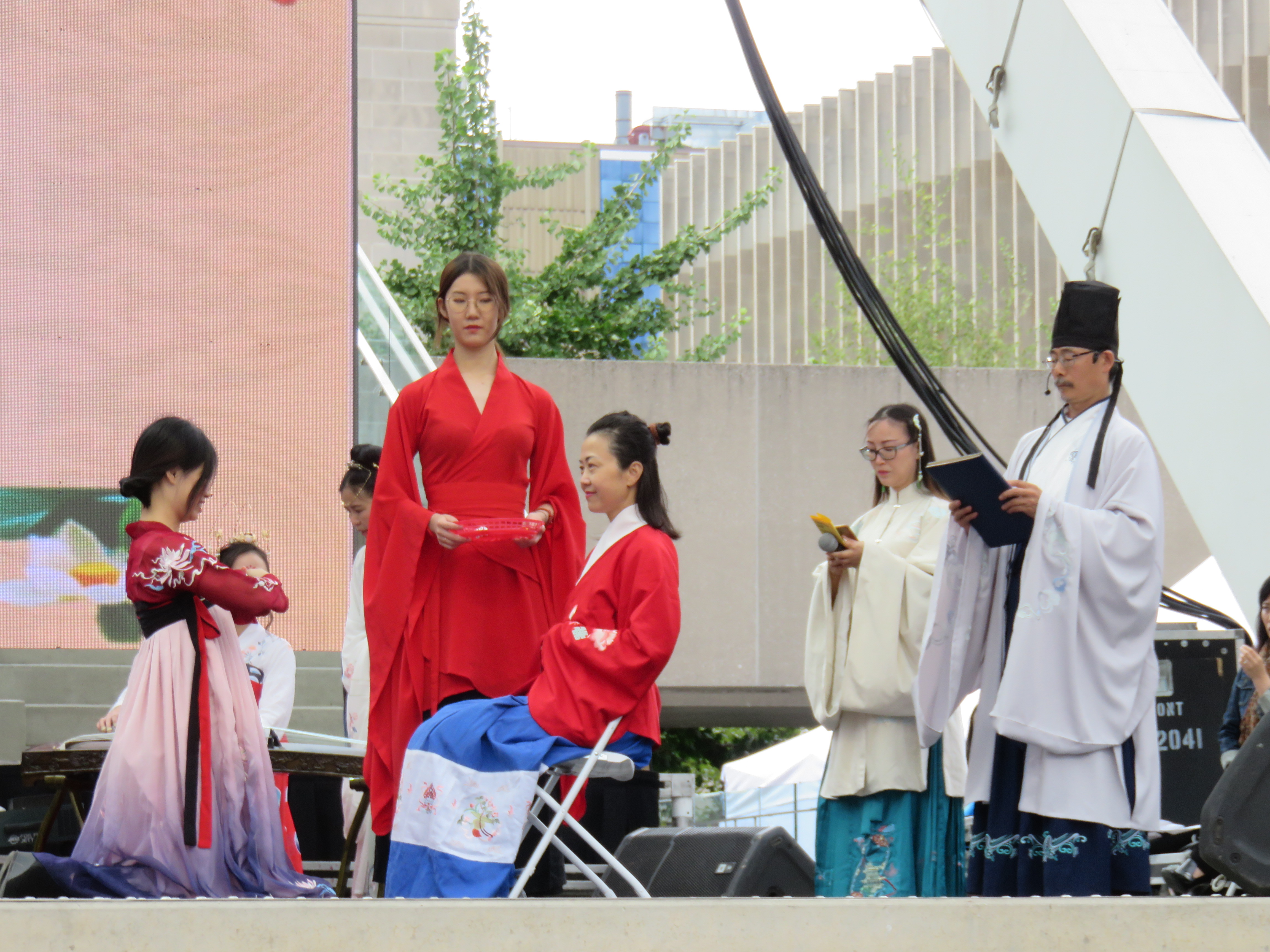 演员穿着汉服进行了拜师礼和成人礼的演示。