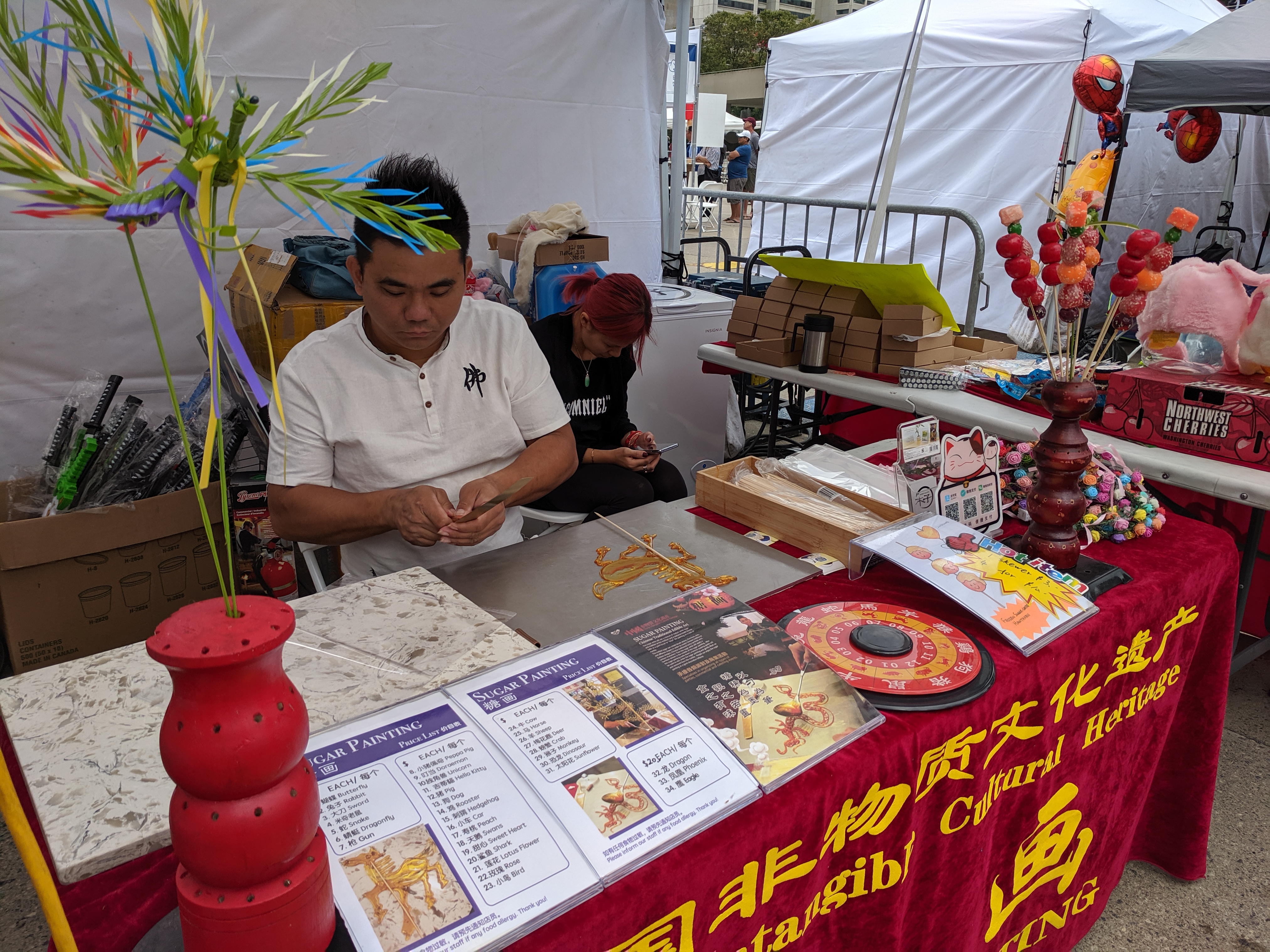现场除了有儿童游乐区、赞助商摊位等街头盛会常客外,还有不少展示中国文化的摊位,例如民俗、书法、糖画,有的免费,有的收费。