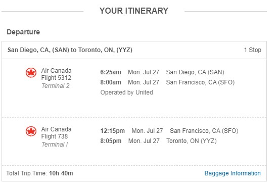 我早在6月15日就通过FlightHub预订了圣迭戈经旧金山飞回多伦多的机票,由加拿大航空出票,第一段美联航执飞,7月27日凌晨6:25出发,上午8点抵达旧金山;第二段加拿大航空执飞,中午12:15离开旧金山,晚上8:05抵达多伦多。