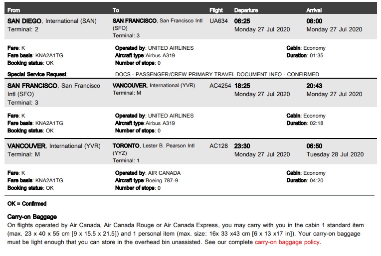 我听了一会儿电话就断线了,只能重新拨打加航客服电话,重复听了一大段电话录音,再次接通另一个加航真人客服。这位加航客服也是一样告诉我应该由旅行社通知我航班变更的情况,但经历漫长的等待,他表示愿意帮我修改机票。他表示现在要登上圣迭戈6:25出发的航班可能太晚,但我告诉他没有问题,美联航告诉我还有很多座位。他最终帮我订上了6:25出发的机票,我实在不明白加航为什么要大幅修改我的机票。加航表示是我原先订的旧金山中午出发的加航航班被取消了,所以给我改成早上7点旧金山出发。可是变更这么大(需要提前一天,26日去旧金山),根本不合法,更别说没提前通知我变更了。加航说只能给我改成旧金山下午6:25飞温哥华转机的航班,次日(28日)早上6:50抵达多伦多。我的美国入境许可今日过期,我必须今天离开美国,所以既然能今天离开美国,我就同意了。尽管我还有所保留,因为我入境加拿大需要隔离14天,而我希望去多伦多隔离,所以当初买票时特意避开较便宜的温哥华转机航班,买了从美国直飞多伦多的机票。