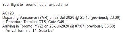 根据加拿大法规,即便航空公司必须修改航班,也应该尽可能安排在9小时内的航班,可是加航却直接把我7月27日早上6:25的航班改成了7月26日下午6:30出发的航班,变更几乎整整12小时,还需要在旧金山过夜。