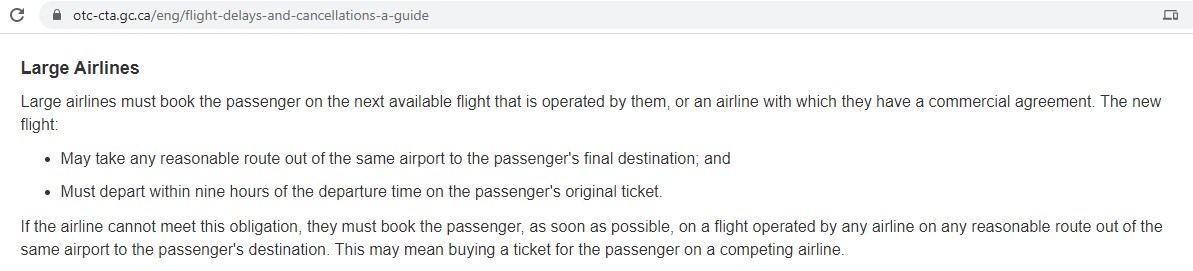 按照加拿大交通部的法规,如果起飞变更超过9小时,航空公司应该选择购买其他航空公司的机票安排乘客搭乘合理的路线,而不是像加航那样把我的航班起飞时间大幅改动12小时。