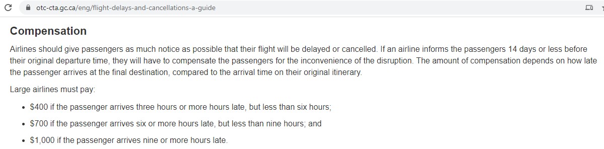 按加拿大法规,延误超过9小时要赔偿1000加元。