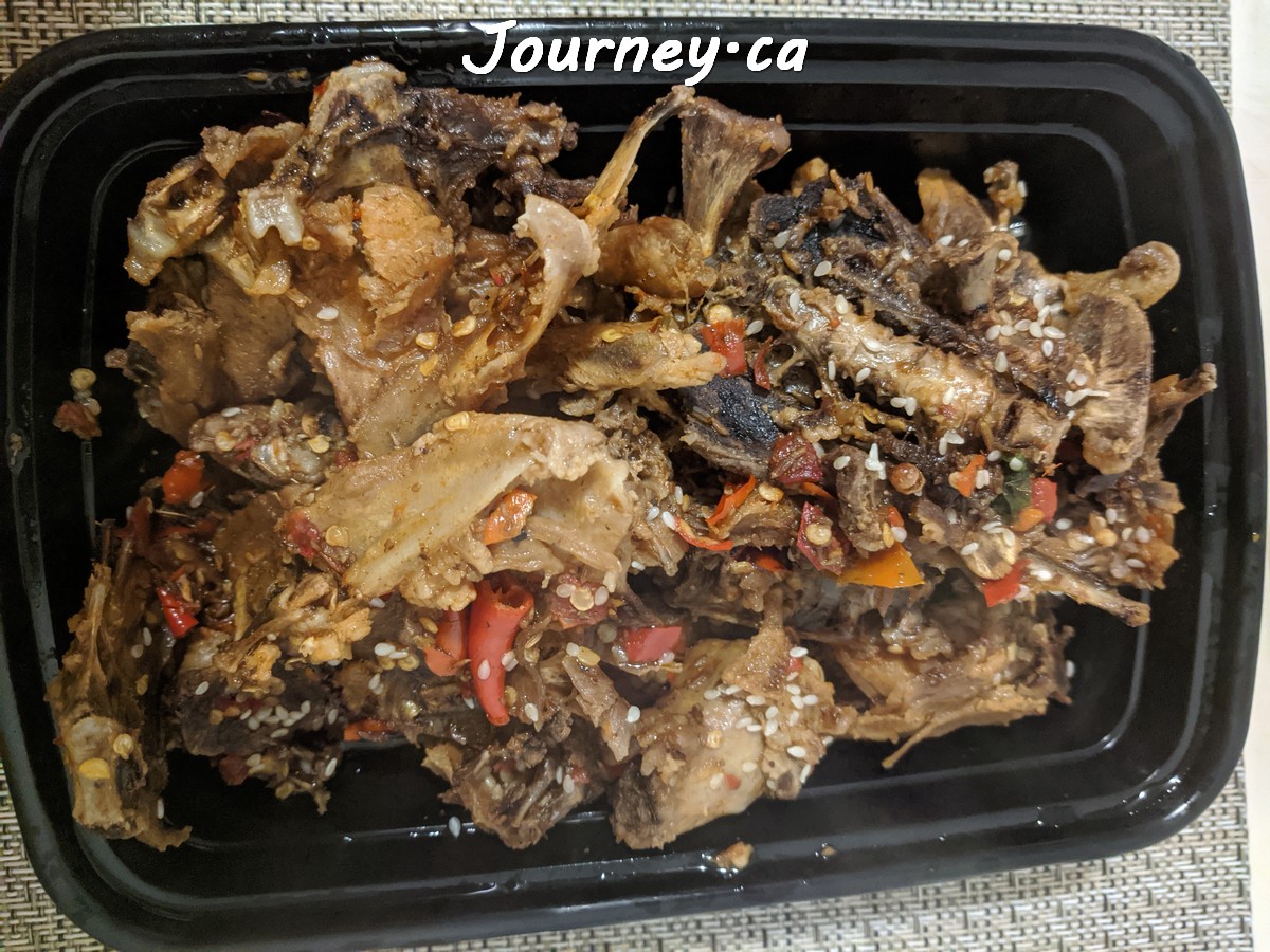 火焰山肉骨架:1星差评。所谓肉骨架其实是那种餐厅用来熬汤后剩余的鸡架子,几乎吃不到任何肉,仿佛买回来帮餐厅丢垃圾似的。倒是辣椒、芝麻、孜然这些调味品没少放,或许适合喝啤酒吧。