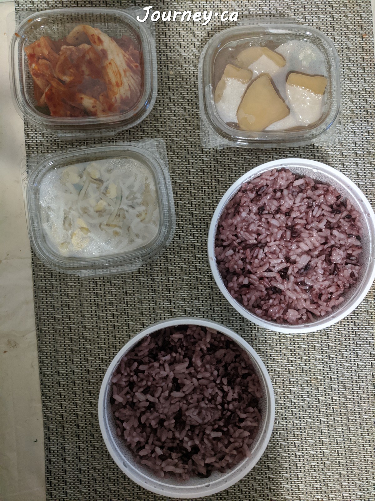 我点了两个汤,获赠2碗紫米饭和3样小菜:泡菜、黄豆芽、甜土豆。
