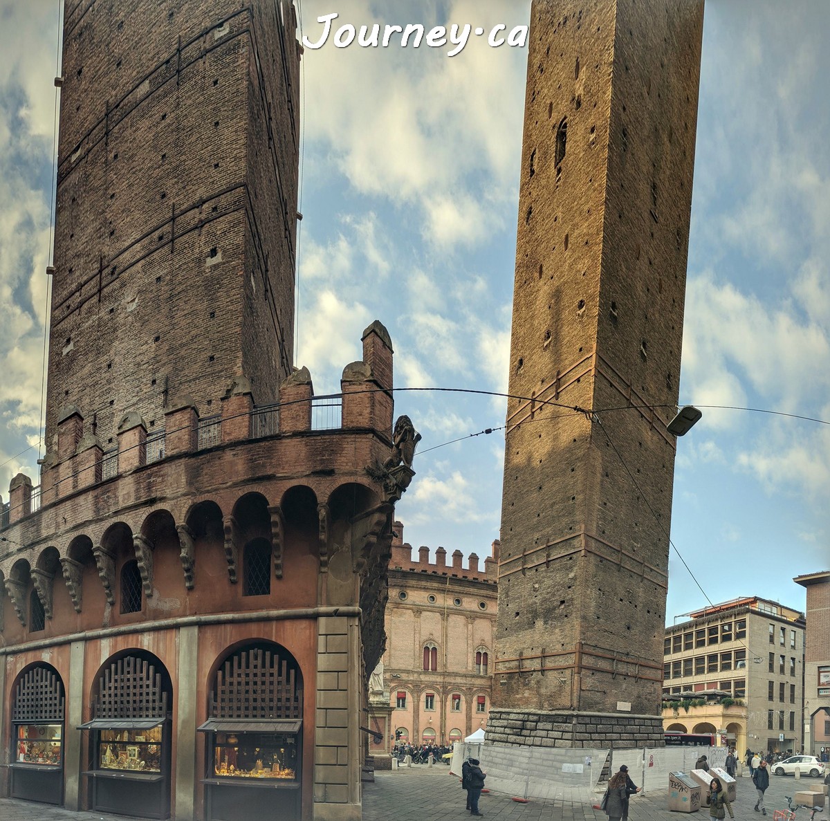 Via Ugo Bassi大街最东端就是著名的斜塔Asinelli Tower和Garisenda Tower了。Asinelli Tower高达近百米,Garisenda Tower则明显倾斜,摇摇欲坠,两者都具有极高的视觉冲击度,路过的游客无不驻足拍照。